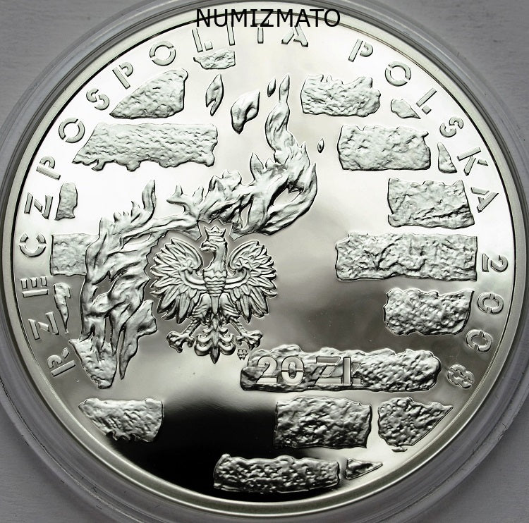 Srebrna moneta kolekcjonerska o nominale 20 zł wyemitowana przez NBP dla upamiętnienia 65. Rocznicy Powstania W Getcie Warszawskim.