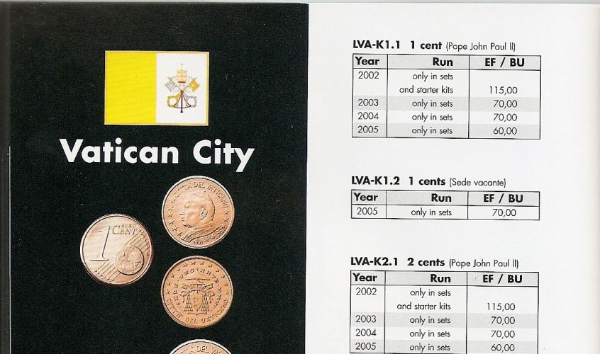 Zawiera spis monet z nastepujących krajów: Belgia, Niemcy, Finlandia, Francja, Grecja, Irlandia, Włochy, Luksemburg, Malta, Monako, Holandia, Austria, Portugalia, San Marino, Słowacja, Słowenia, Hiszpania, Watykan, Cypr