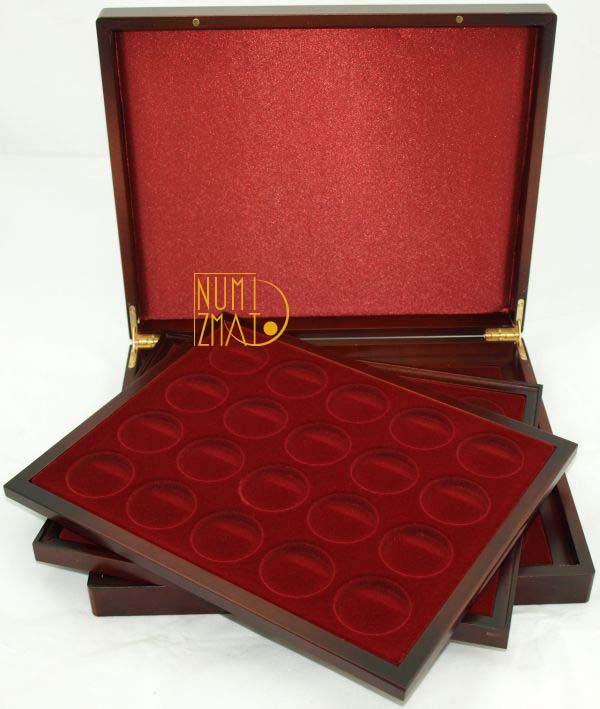 Kasety wykonane są z wysokiej jakości mahoniu i posiadają 3 "tacki" do przechowywania monet w systemie "piętrowym". Wewnątrz wykończone są flokiem w kolorze bordowym. Przeznaczone do monet 20 zł Ag w kapslach NBP